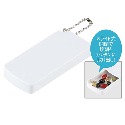 持ち運びに便利なポケットサイズな上、スライド式で便利なピルケースです。シンプルな形状のためオリジナル名入れがよく映えて訴求効果も抜群!ノベルティグッズ用などとして人気です。