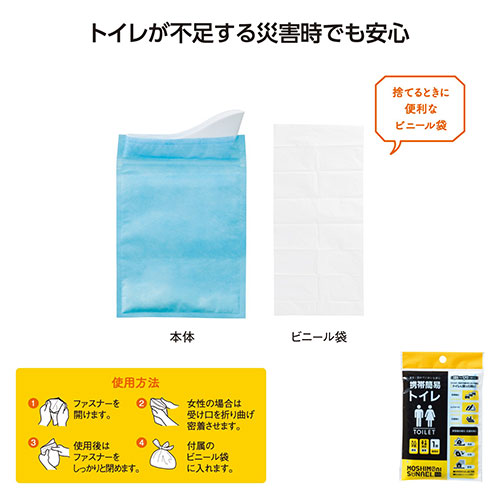 災害時はもちろん、車での長距離移動やアウトドアシーンでも非常に役立つ携帯簡易トイレです。備えておくと何かと安心なアイテム。イベント等の特典用などにもおすすめです。