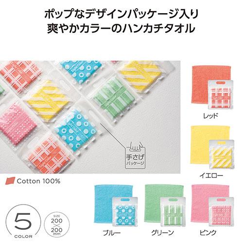 オシャレでポップなパッケージデザインと、元気を与えるカラーがひと目を惹きつける、コットン100%素材のハンカチタオルです。パッケージは持ち手付きでイベント等での配布にも最適です。