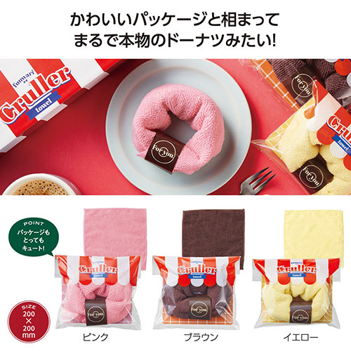 ドーナツようなパッケージデザインがとっても可愛らしておもしろいハンカチタオルです。ピンク、ブラウン、イエローの三色アソート。イベント等で配布するちょっとした特典用などにおすすめ。