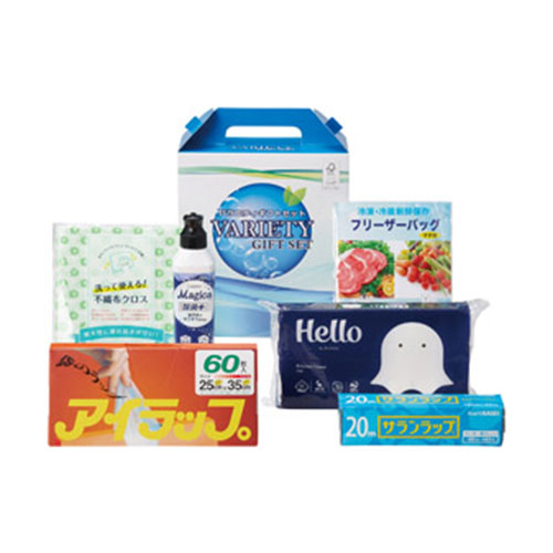 洗濯洗剤や食器用洗剤、ラップ、フリーザーバッグ等、日常生活で無くはならないアイテムを6点詰め合わせたギフトセットです。イベントなどの特典や景品用などとしても人気の商品です。