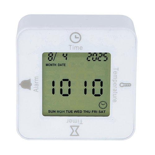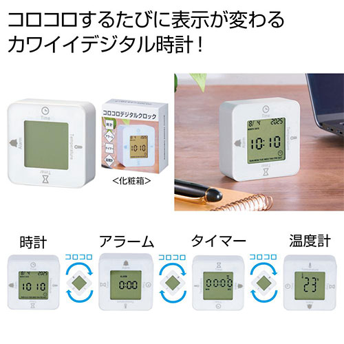 本体をコロコロと回転させるだけで、時計、アラーム、温度計、タイマーの4つの機能を切り替えて使えるユニークなアイテム。気分に合わせて、または必要な機能に合わせて楽しく使いこなせます。