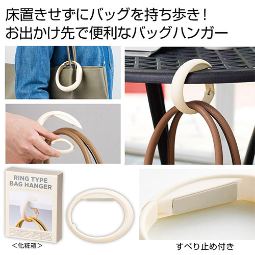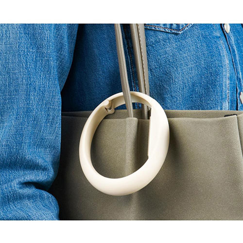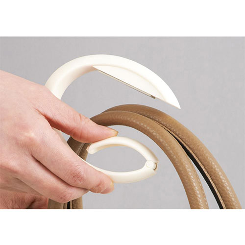 買い物中に荷物カゴがないお店でも、バッグを床に直置きせずに済む便利なバッグハンガーです。普段からバッグの持ち手にリングとしてつけておけば、使いたいときにサッと取り出せます。