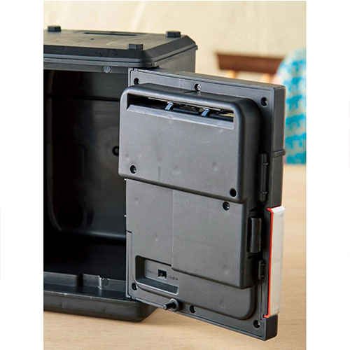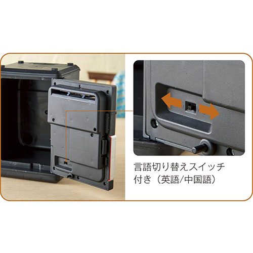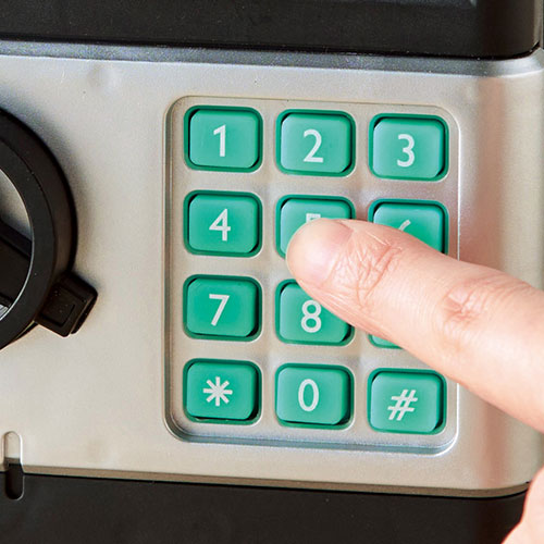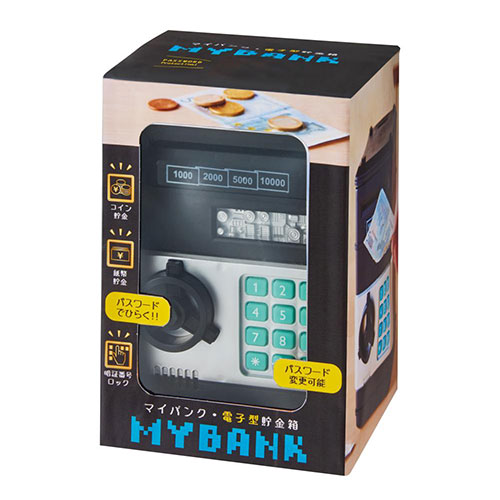 暗証番号で開ける音声機能付きの電子貯金箱。紙幣を入れると音楽が流れ、自動で吸い込まれていきます。硬貨も貯金できます。暗証番号の入力は、正しい番号か間違っているかを音声でお知らせ。