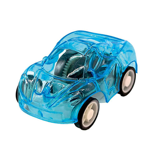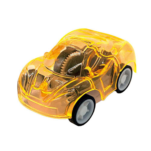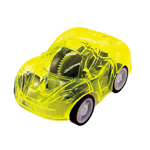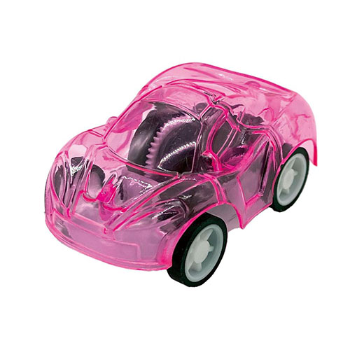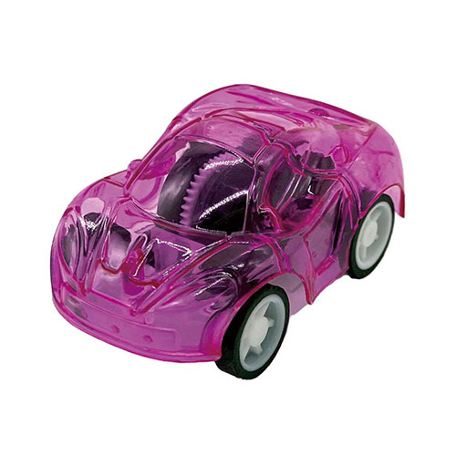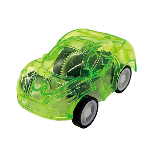 透明なボディが目を引く、小さなプルバックカーです。後ろに引いて手を離すと、勢いよく走り出します。お子さま向けのバラマキ景品や、イベントのプチギフトにぴったりのアイテムです。