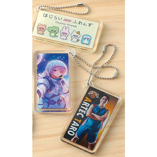 オリジナルの印刷ができる、スタンダードな長方形のアクリルキーホルダーです。写真やイラスト、ロゴなどを自由に印刷でき、300個から作成可能です。ボールチェーン付き。