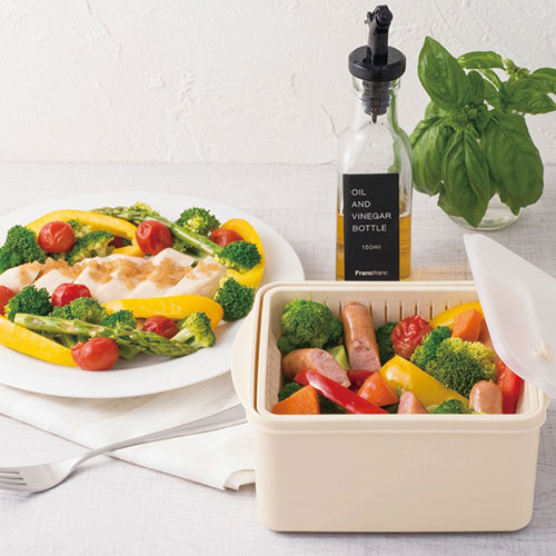 時間のかかる蒸し料理がレンジで簡単にできちゃうヘルシーレンジスチーマー。浮かせるザルは料理の下準備にも便利な上、容器は保存用としても利用可能で冷蔵庫にそのまま入れてもOK!