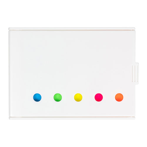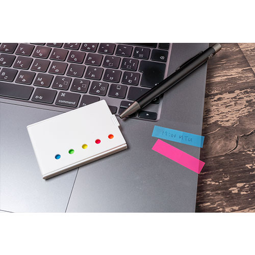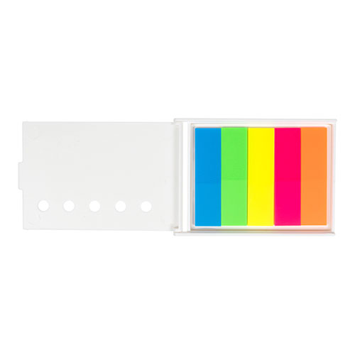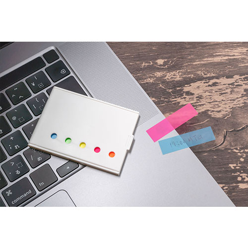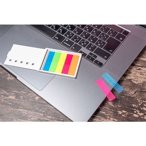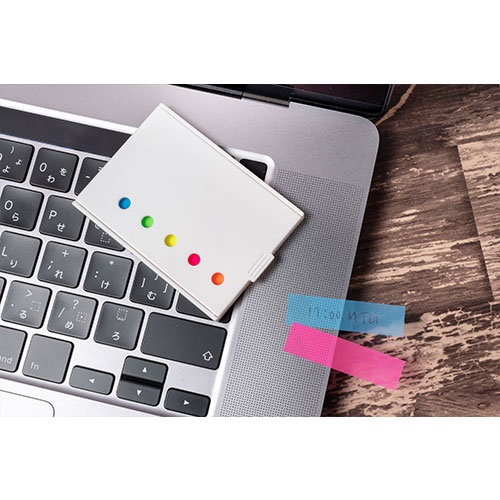 携帯に便利なハードケース付きの5色フィルムフセンです。半透明素材を採用しているため、貼った下の文字も透けるため確認でき、紙に比べて破れにくい点が大きな特長です。