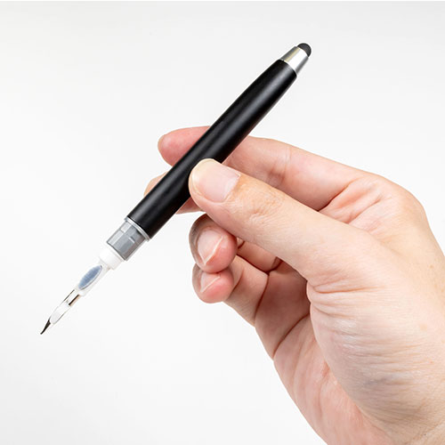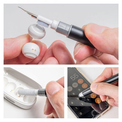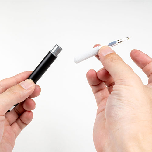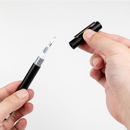 タッチペンとワイヤレスイヤホン用クリーナーが一体になった多機能ツール。タッチペンでスマホやタブレットを操作でき、キャップを外してクリーナーを使えばイヤホンを清潔に保てます。