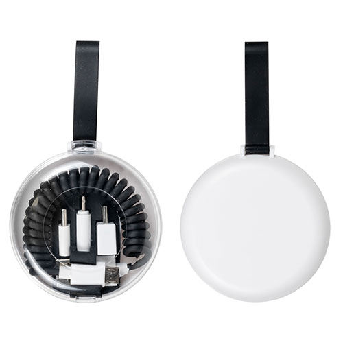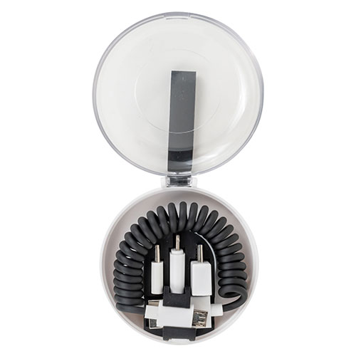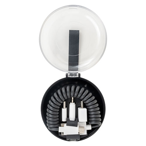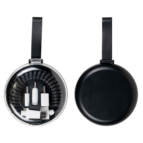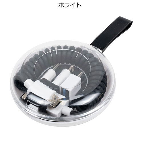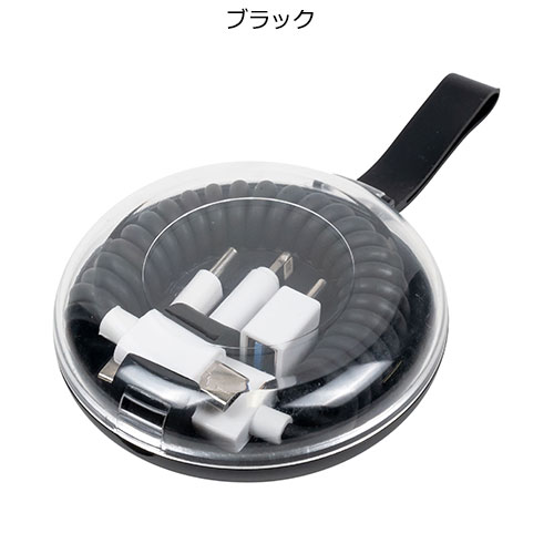 スマートフォン用充電ケーブルがコンパクトケースに収納。3種の変換プラグ付きで多機種に対応し、コイル状で伸縮性があるため、邪魔にならず手軽に携帯できて旅行などにも便利です。