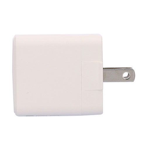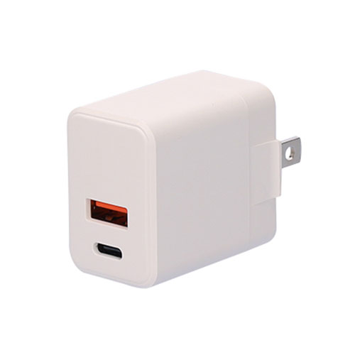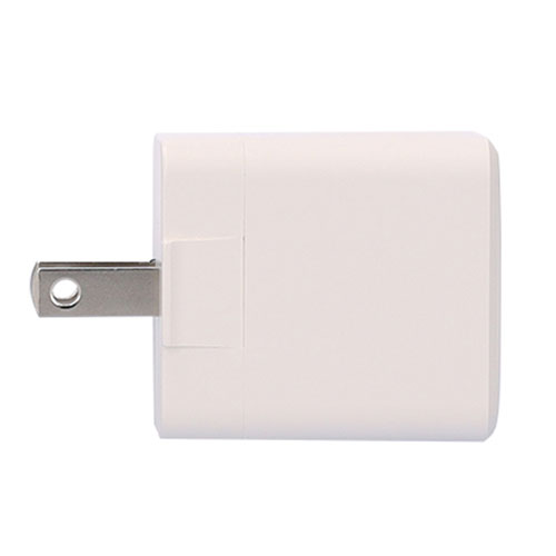 電源プラグを本体に折り畳んで収納できる、携帯用に最適な2ポートアダプター(20W)。100V-240V電圧対応で海外旅行にも最適!各種ノベルティや物販品としてご活用ください。