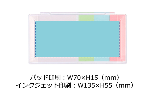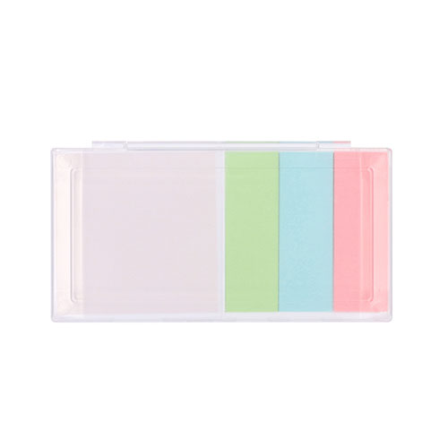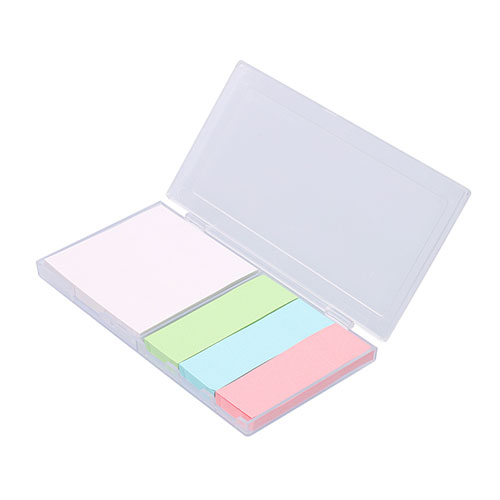 専用のクリアケースに、4種のふせんが収納されているセット商品。オリジナルの名入れ印刷をすることで、各種ノベルティや物販品としても、幅広く活用することができます。