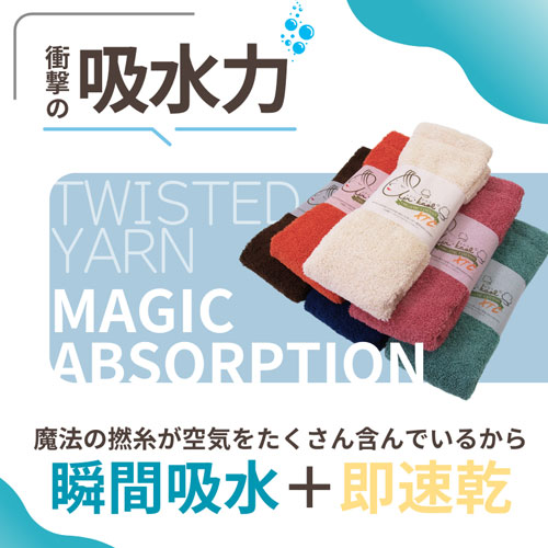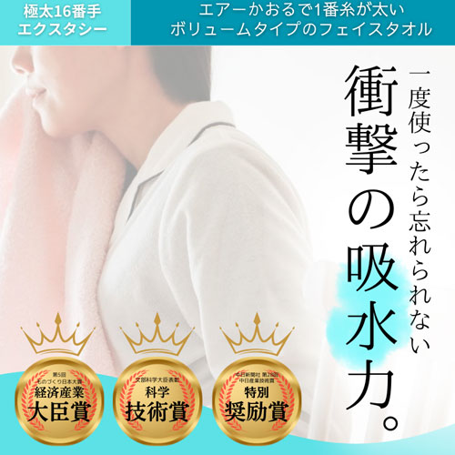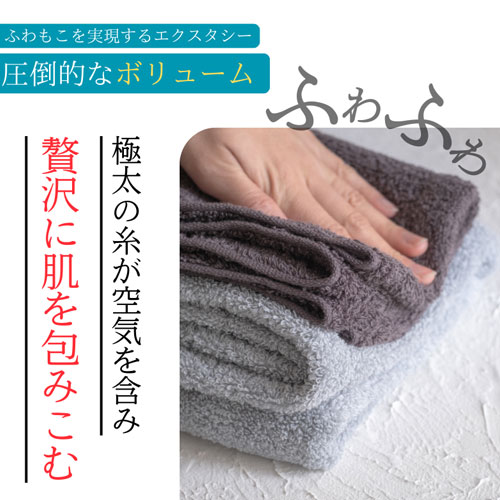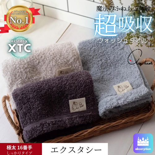 約34×40cmサイズの、エクスタシーシリーズのウォッシュタオル。驚きの吸水性と、ボリューム感のあるふわふわもこもこの手触りが癖になるアイテムです。ノベルティ用等にもおすすめです。