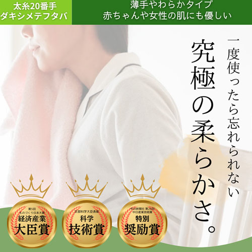 福島県・双葉町と共同開発した、【ダキシメテフタバ】シリーズのバスタオル。特殊な乾燥仕上げで、非常に柔らかな質感と吸水性が特徴。繰り返しのお洗濯でもふわふわ感が長続きします。