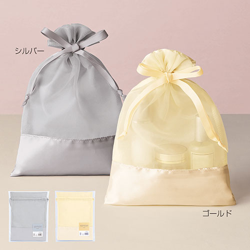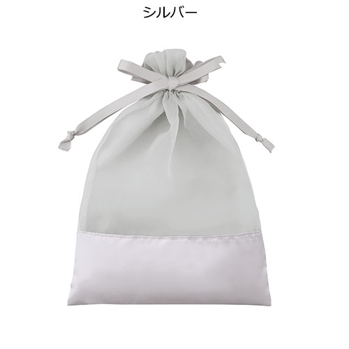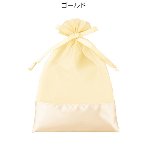 サテンとオーガンジーを組み合わせた、エレガントな異素材MIXがお洒落なギフト巾着。程よい透け感で中身をさりげなくアピールでき、ノベルティやギフトにも最適なアイテムです。