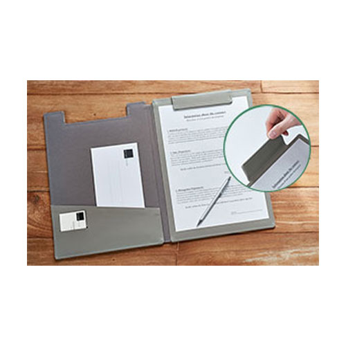 高級感ある合成皮革のカバー付きで、360°折り返して使えるA4ヨコ型クリップボードです。/マグネット式クリップを採用し、書類を約10枚までしっかりとホールドします。