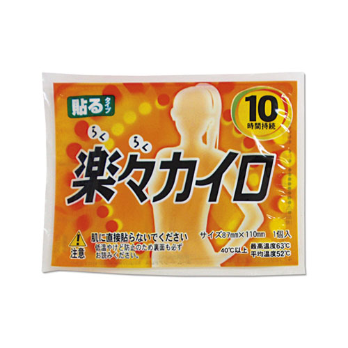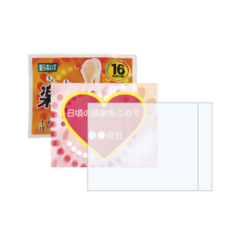 冬ノベルティの定番、らくらくカイロ(貼るレギュラータイプ)。フルカラーで名入れ印刷した、オリジナルデザインのチラシも封入できるので、配布・プレゼント用などの販促品として重宝します。