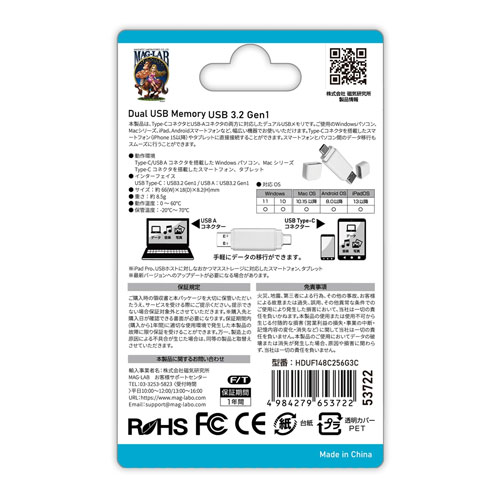 256GB容量のUSB3.0メモリ。Type-C、USB Aのどちらにも対応可能なため、2種類のUSBメモリを持ち歩く必要がありません。パソコン等データ移行等に非常に便利です。