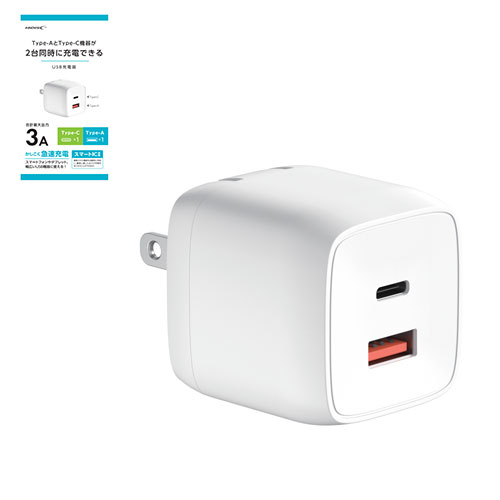 サイズ 約W39×H39×D41mm機能 入力:AC100-240V 50/60Hz 出力(2ポート):USB 3A、TypeC 3A 合計最大3A