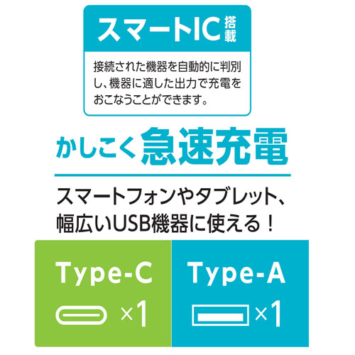 家庭用コンセントから2台まとめて充電可能。USBとType-Cポート搭載で、スマホやタブレットに幅広く対応します。デスク周りの配線を減らし、効率よく充電できる一台です。