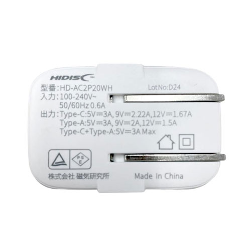 サイズ 約H45×W43×D28.1mm機能 入力:AC100-240V 50/60Hz 0.6A 出力(2ポート):TypeC PD20W、USB 18W