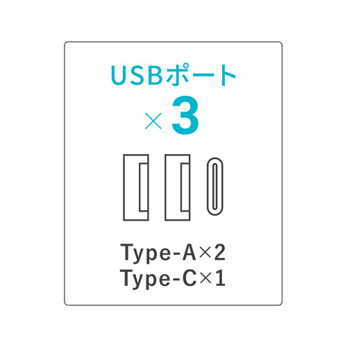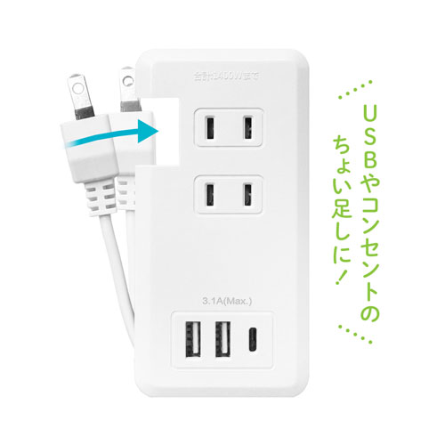 素材 ABS樹脂サイズ 約W62×D26×H120mm コード長/約200mm機能 口数/ポート数:ACx2個口、USB TypeA(最大5V2.4A)x2ポート、USB TypeC(最大5V3A)x1ポート ※USB TypeA+C合計最大(5V3.1A)