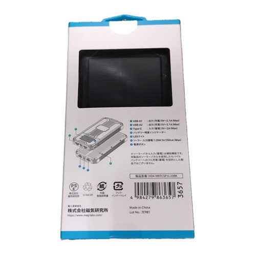 サイズ W79.5×D19.5×H162mm容量 3.7V/10000mAh(37Wh)重量 約269g機能 バッテリータイプ:リチウムイオンポリマー 入力:1ポート(TypeC 2A) +ソーラパネル1面(250mA) 出力:2ポート(USB 2.1Ax2) 保護回路:ショート、過充電、過放電、過電流、過熱防止付属品 Type-A to Type-C ケーブル、ハンドストラップ