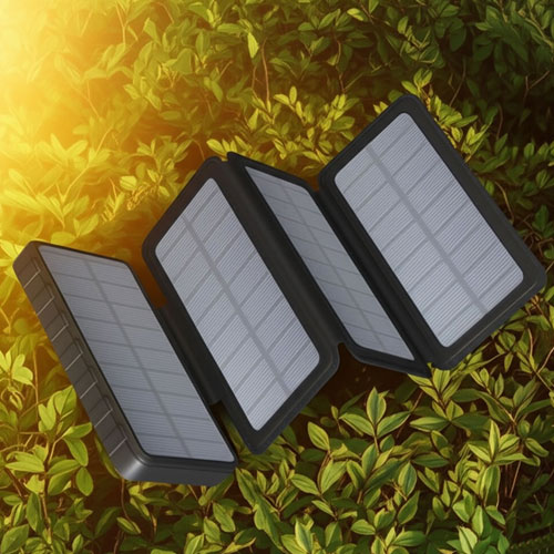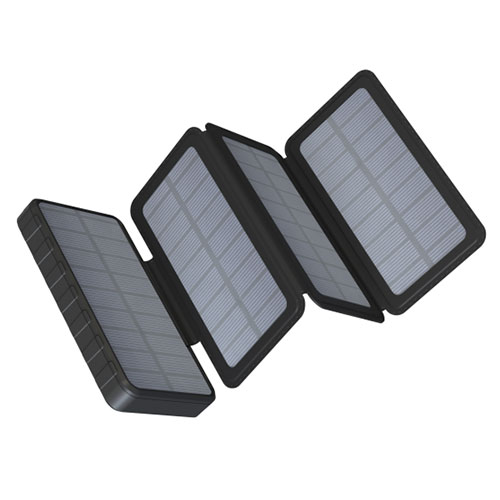 4面のソーラーパネル付き急速充電モバイルバッテリー。コンセントがなくても太陽光で自己充電可能。アウトドアや災害時の電力確保に役立ちます。普段使いにも便利なアイテムです。
