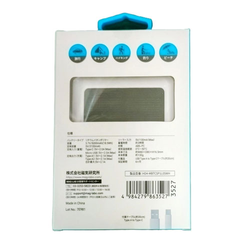 素材 ABS、PCサイズ 約W80×D80×H16.5mm容量 3.7V/5000mAh(18.5Wh)重量 約130g機能 入力:2ポート+ソーラーパネル TypeC(2A)、マイクロUSB(2A)、ソーラーパネル1面(130mAh) 出力:2ポートUSB(2.1A)x2付属品 USB Type-A to Type-Cケーブル(約30cm)