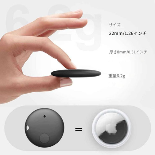 サイズ 約W32xD32xH8mm重量 約6.3g機能 防水防塵:IP67 対応アプリ:Apple Find My 対応システム:iOS14.5〜 電池:CR2032(別売)付属品 紛失防止タグ1個、タグケース(キーホルダー型)1個、取扱説明書兼保証書1部