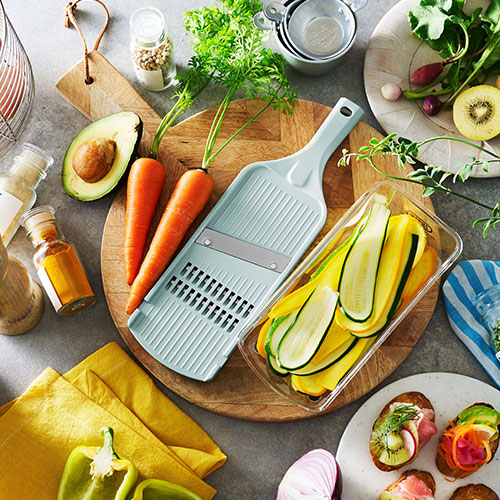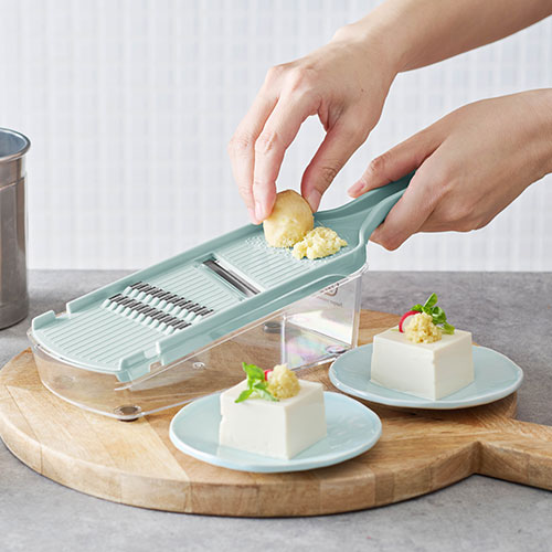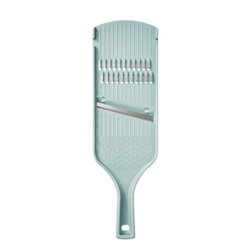 これ1台で薄切り、細切り、薬味おろしの3役をこなせるスライサーです。コンパクトなハンディタイプなので、調理中の鍋やボウルの上でもサッと使えて、食材スライスが楽になります。