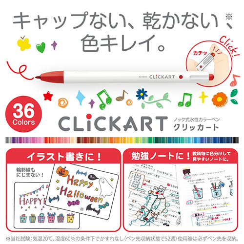 キャップなしでも乾かない! 空気中の水分を吸収する「モイストキープインク」を新搭載したノック式水性カラーペン。ノックするだけで、いつでも簡単にカラフルな書き味を楽しめます。