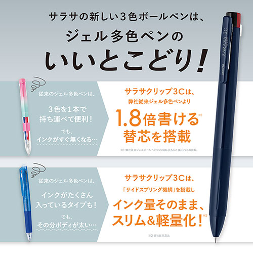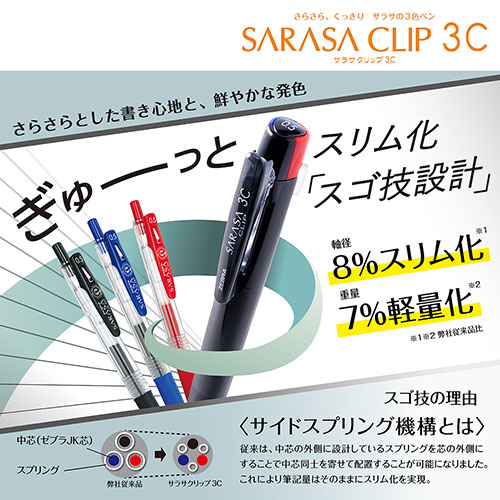 0.5mmの3色ジェルボールペンがスリム化! 独自開発の「サイドスプリング機構」で、従来品より8%細く7%軽く。インク量を保ちつつ日常使いしやすい太さを実現しました。