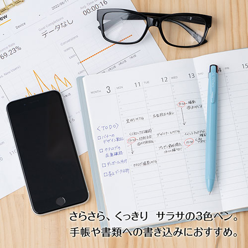 0.4mmの3色ジェルボールペンがスリム化! 独自開発の「サイドスプリング機構」で、従来品より8%細く7%軽く。インク量を保ちつつ日常使いしやすい太さを実現しました。