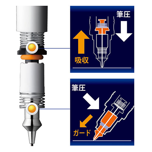 どれだけ力をかけても芯が折れない! 筆圧や角度に合わせて芯をガードする新開発の内部機構を搭載。短い芯でもずれて詰まることがない、ストレスフリーなシャープペンです。