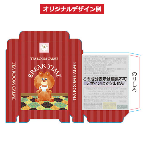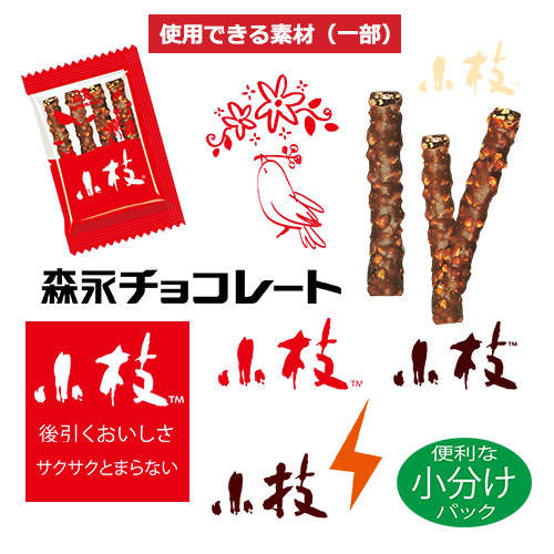 チョコレートと焙煎アーモンド、2種類のパフの食感と味わいが楽しめる枝の形の人気チョコレート「小枝」。メーカー公式素材を使用したオリジナルパッケージの作成も可能です。