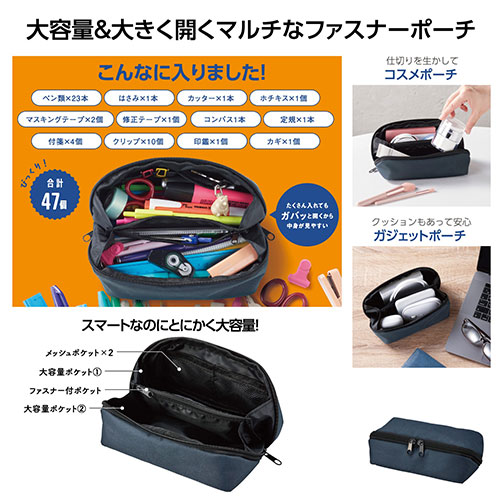 ガバッとフルオープンする構造で、中身の確認や取り出しがスムーズなポーチです。小物を整理できる便利なポケット付き。使いやすさにこだわった、鞄の中をすっきりスマートに整えます。