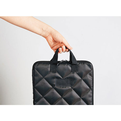 上品なキルティング生地のモバイルバッグ。豊富なポケットで小物を賢く仕分けでき、タブレットも収まるサイズ感です。機能性とデザイン性を兼ね備え、毎日の持ち運びをスマートに彩ります。