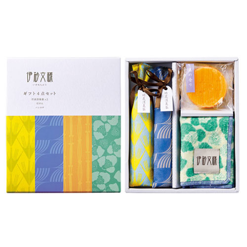 京都の伝統「伊砂文様」が彩る和柄ギフト。竹炭消臭袋2点、森の香りの石鹸、綿100%タオルの実用的な4点セットです。伝統美と癒やしを詰め込んだ、贈り物に最適な一品。