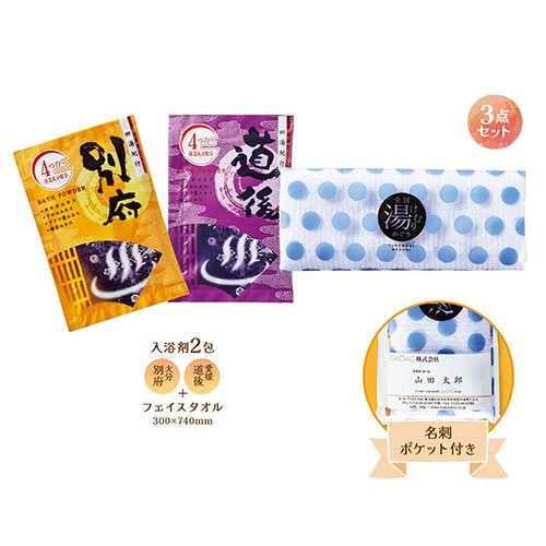 素材 タオル/綿サイズ タオル/300×740mm付属品 セット内容/入浴剤25g×2包(別府・道後)・タオル包装 包装袋(名刺ポケット付)