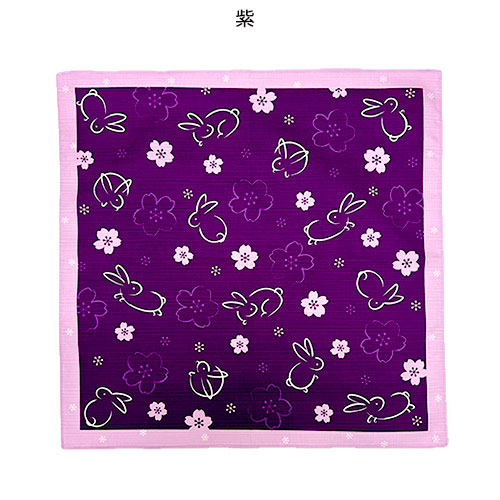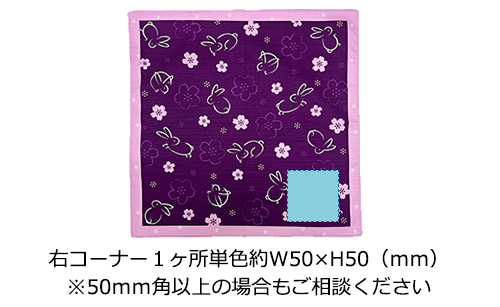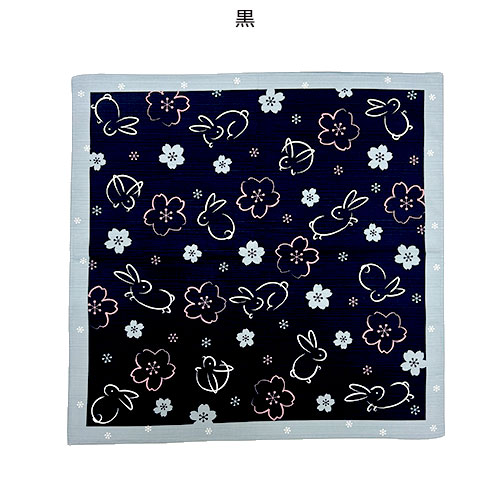 うさぎと桜の花をモチーフにデザインされた、約50×50cmサイズのシャンタン小風呂敷です。カラーバリエーションは紺、紫、黒の全3色展開。ノベルティ用におすすめです。
