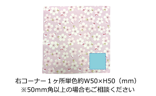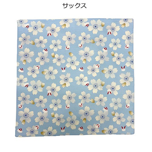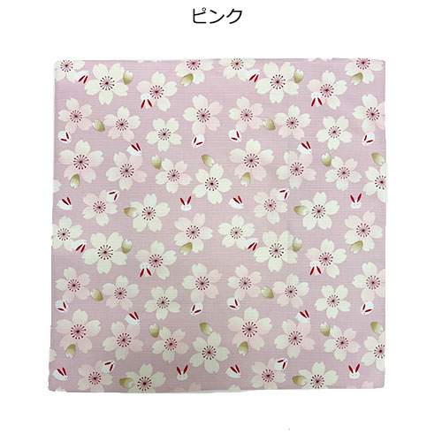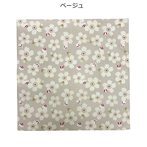 桜の花とうさぎをモチーフに可愛らしくデザインされた、約50×50cmサイズのシャンタン小風呂敷です。カラーバリエーションはピンク、サックス、ベージュの全3色展開です。
