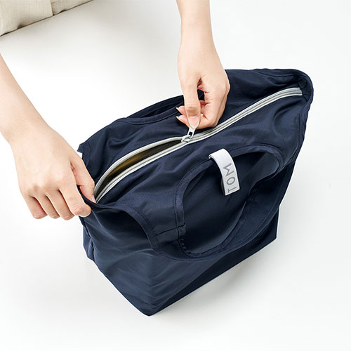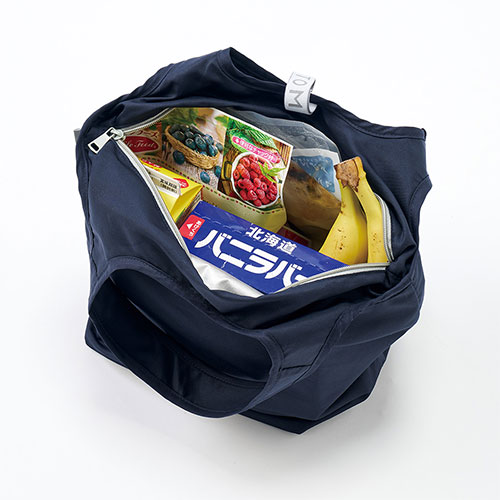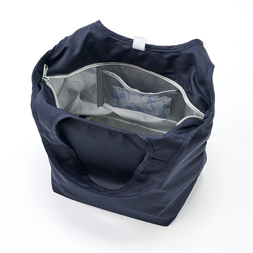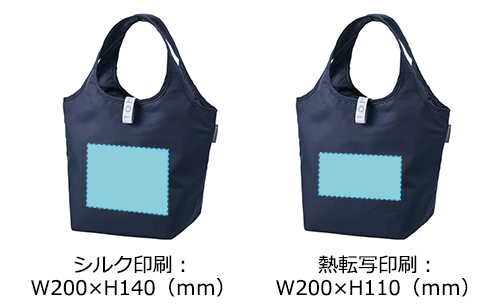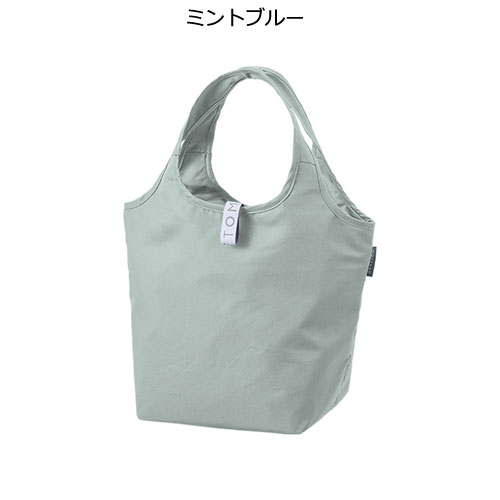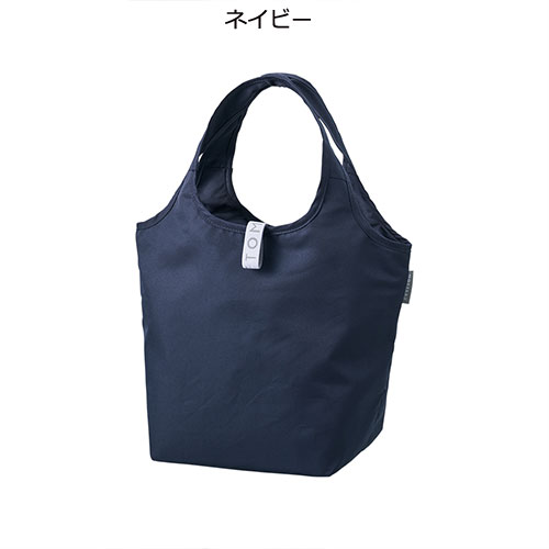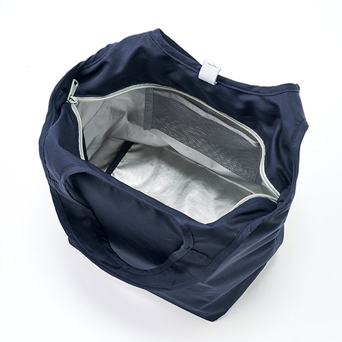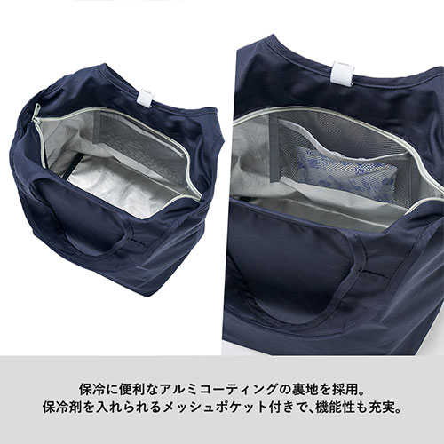 セルフレジのバーに掛けて使える便利な保冷見にマルシェバッグ。ゴムでコンパクトに畳め、内側には保冷剤用ポケット付き。底芯材入りで安定感もあり、食料品店のノベルティに最適です。