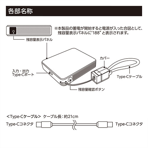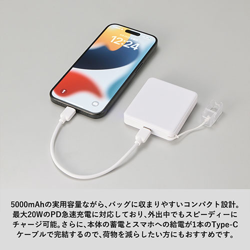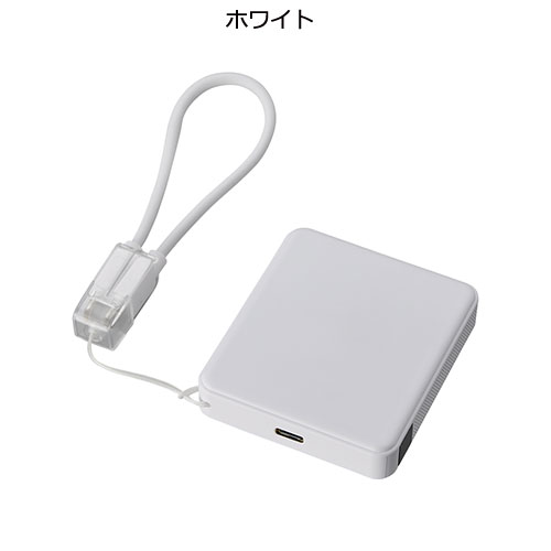 カラー展開 全2色素材 ABS 他サイズ W60×H68×D15(mm)重量 約95g機能 最大出力3A、バッテリー容量5000mAh付属品 取説付、コードストラップ(Type-Cケーブル)、デジタル表示機能付包装 エアパッキン、紙箱注意事項 ※スマートフォンの充電ポートがライトニング形状などの場合、変換プラグが必要な場合があります。