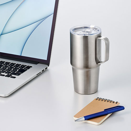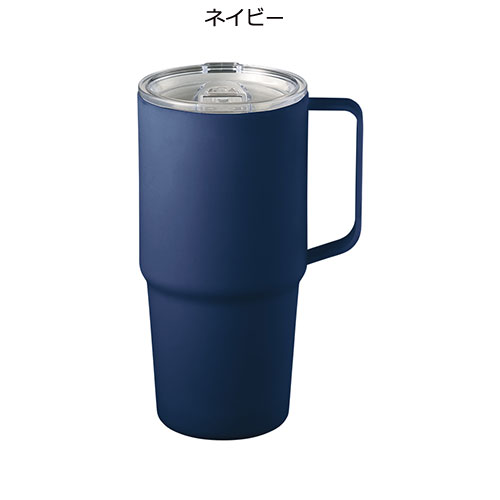 トレンドの630ml大容量トールマグ。真空2層構造で保温保冷に優れ、スライド蓋付きで衛生的です。持ちやすいハンドル形状も魅力。デスクワークやレジャーの記念品に最適です。