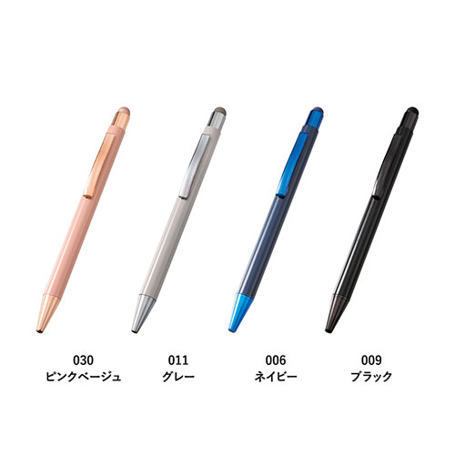 ワントーンで揃えた色調がスタイリッシュな、タッチペン付き金属ボールペン。高級感があり、世代を問わず喜ばれます。フルカラーやレーザー名入れが可能で、展示会や企業ノベルティに最適です。