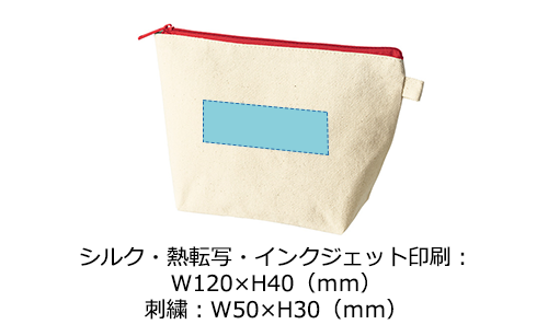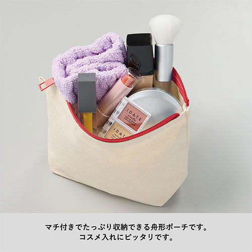 たっぷり収納できるマチ付き舟形ポーチ。全10色のファスナーが映えるシンプル設計です。ループ付きでカスタムも自在。フルカラー印刷対応で、化粧品ノベルティや推し活グッズに最適です。