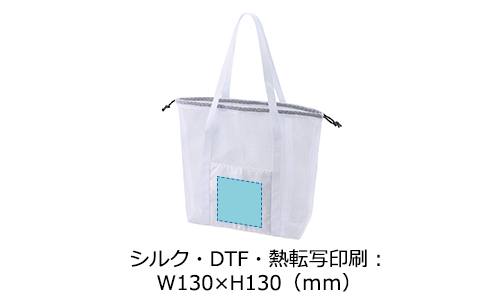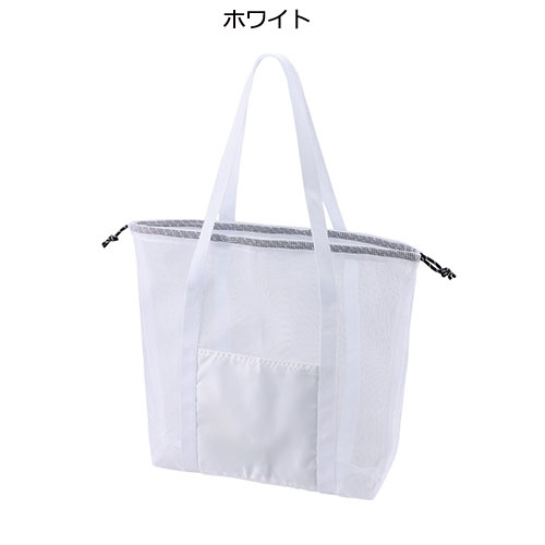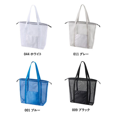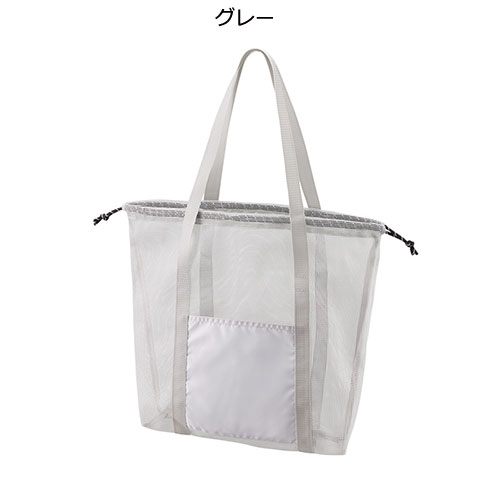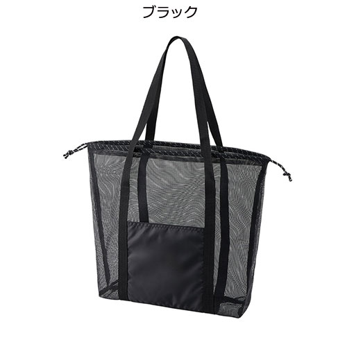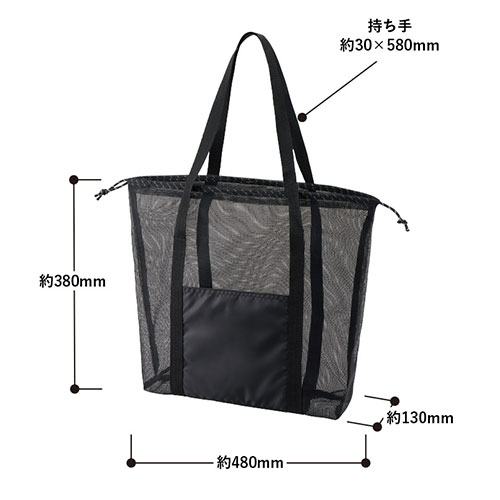 メッシュ素材が映えるLLサイズのフラットトート。口元のテープ使いで頑丈な作りです。小物の収納に便利なフロントポケットはフルカラー名入れが可能。イベント用バッグ等として最適です。