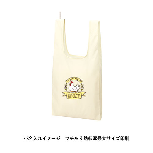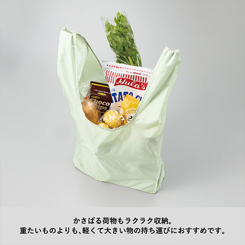 上質な光沢感と超軽量が魅力の、LLサイズのマルシェバッグ。さらっとした手触りの超薄手素材ながら、テープハンドルで持ちやすさと耐久性も確保。フルカラー名入れでロゴも美しく映えます。