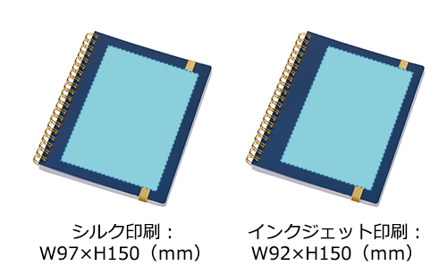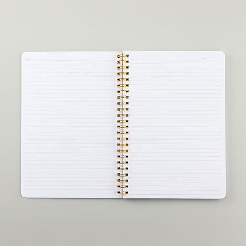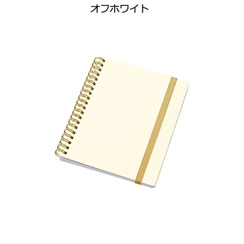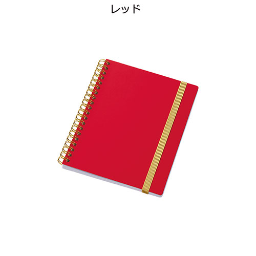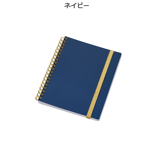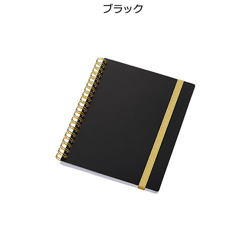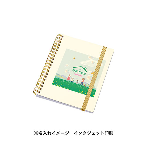 ゴールドのリングとゴムが映える、高級感漂うハンディノート。傷に強いマットコーティングの白厚紙表紙に、日付スペース付きの6mm罫線。フルカラー名入れが可能で周年記念品等に最適です。